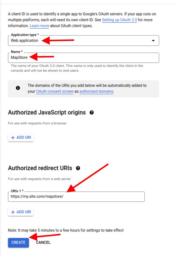 - Set the Application Type to Web Application, name it as you prefer and configure the root of the application as an authorized redirect URI. Then click on Create