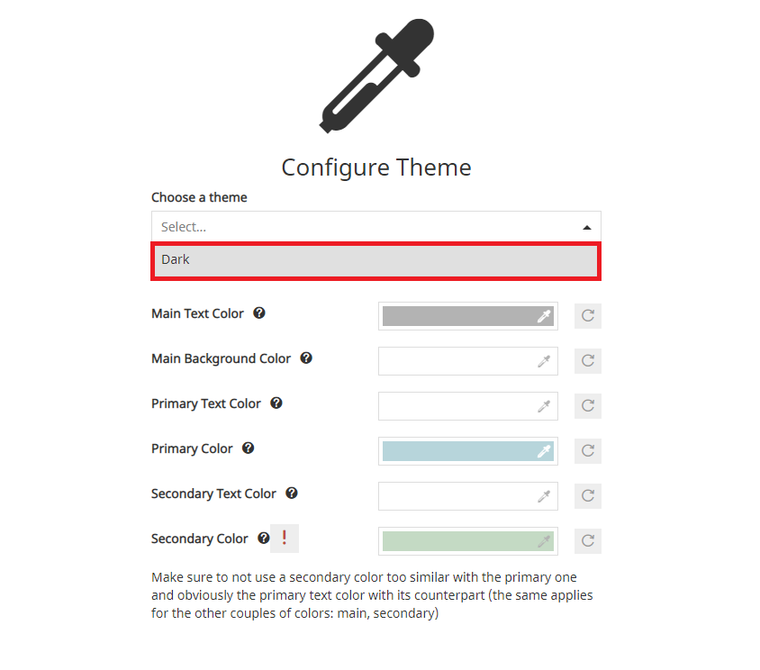 To ensure a good and well readable color contrast between each UI component, make sure to not use a secondary color too similar to the primary one and obviously the primary text color with its counterpart (the same applies for the other couples of colors: main, secondary).