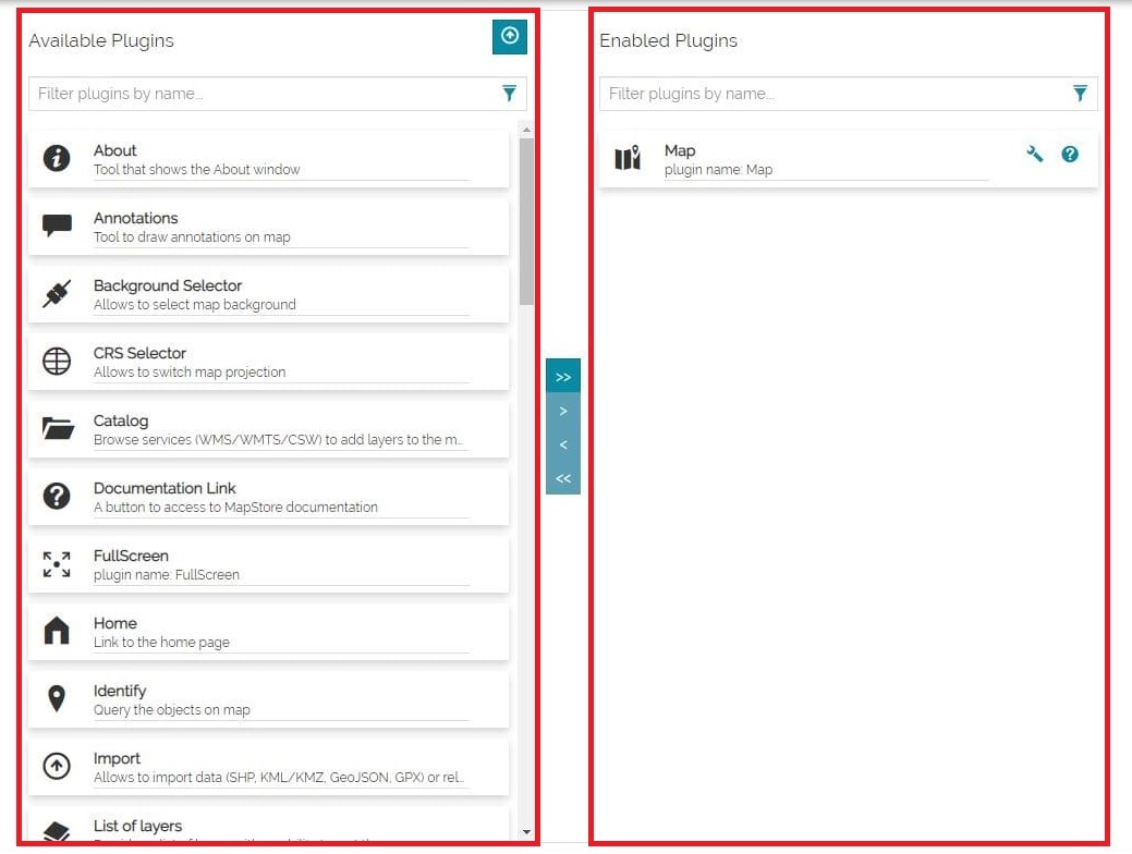 This wizard step allows to select the extensions that will be available in the context viewer: the user of a context will use only the plugins enabled by the user. Within this wizard step, all the available plugins in MapStore are present in the left side list ready to be selected for the context . The right side list contains the list of plugins selected by the user for the context.