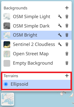 Using the Cesium provider, the user can add a terrain to the Backgrounds Selector list by: