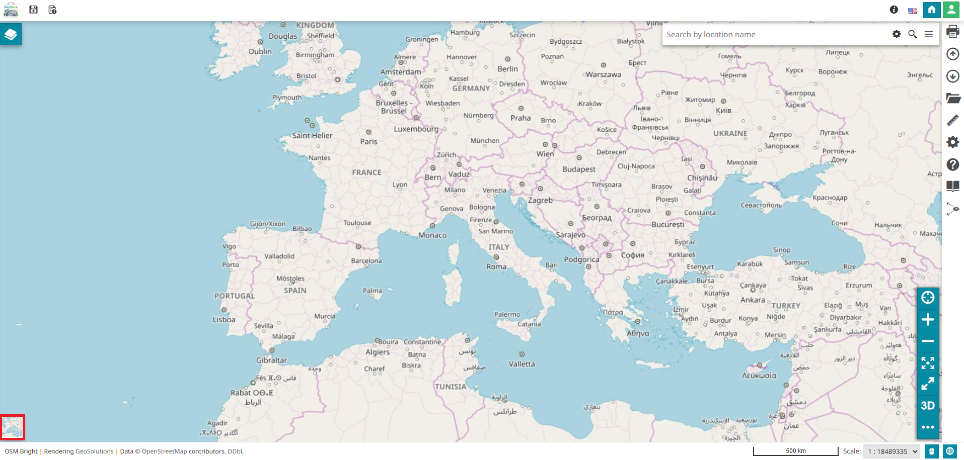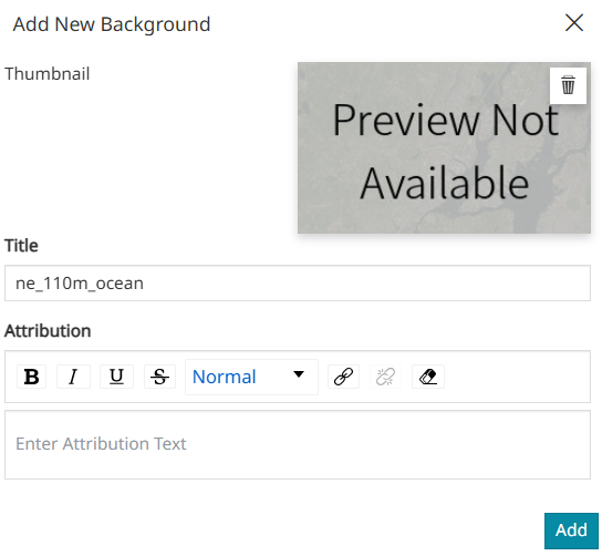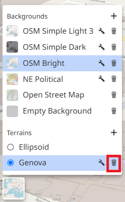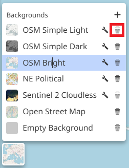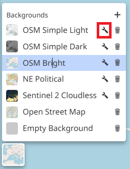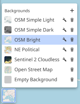 The background selector, located in the bottom left corner of the Viewer, allows the user to add, manage and remove map backgrounds.