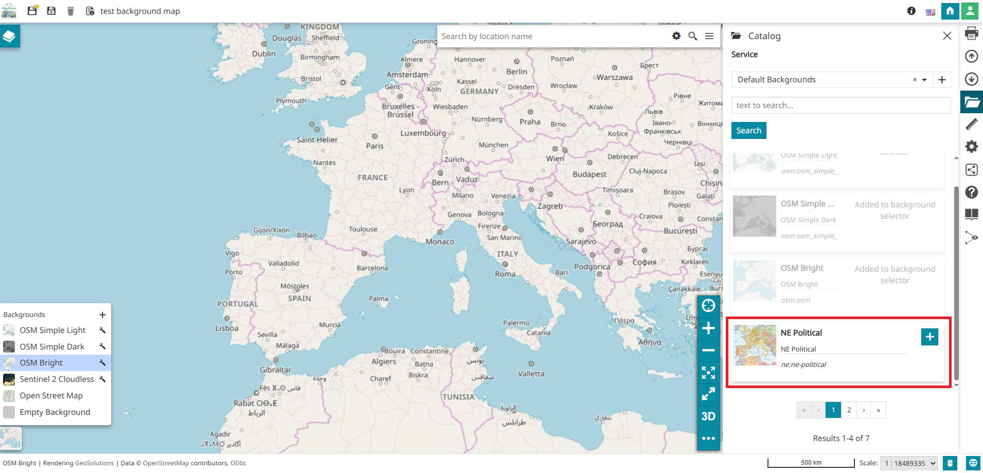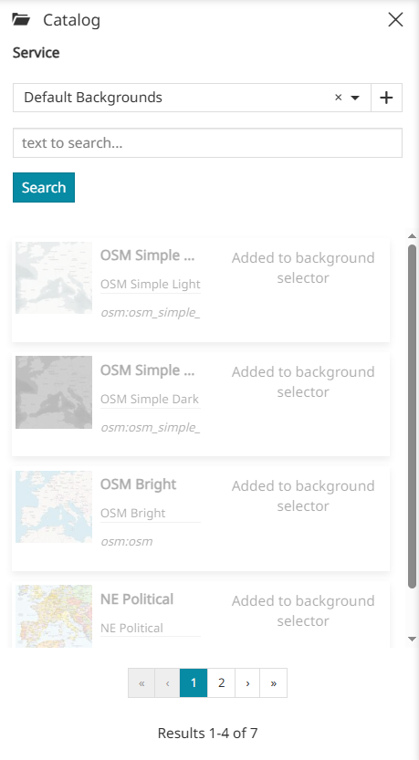By default, for new maps, all backgrounds from Default Backgrounds Service are added to the background selector, and in Catalog they appear grayed (it's not allowed to add the same default background twice): as soon as you remove one from the background selector, it becomes selectable from the Catalog.