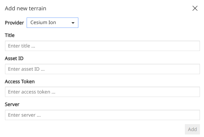 Using the Cesium Ion provider, the user can add a terrain to the Backgrounds Selector list by: