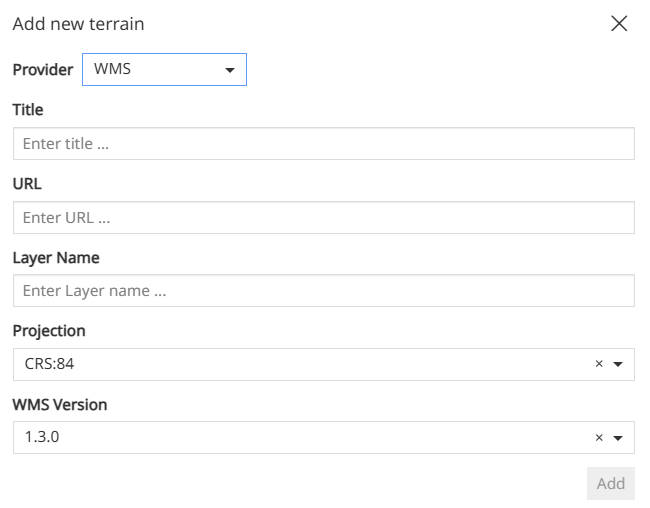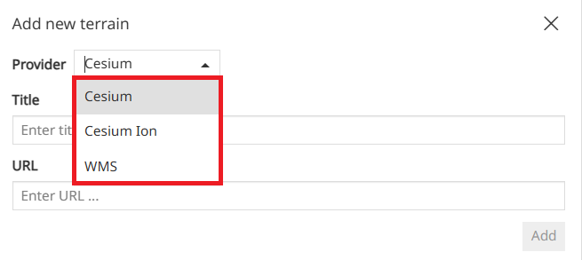 button. This opens the Add New Terrain panel, where the user can select the Provider by choosing between: Cesium, Cesium Ion and WMS.