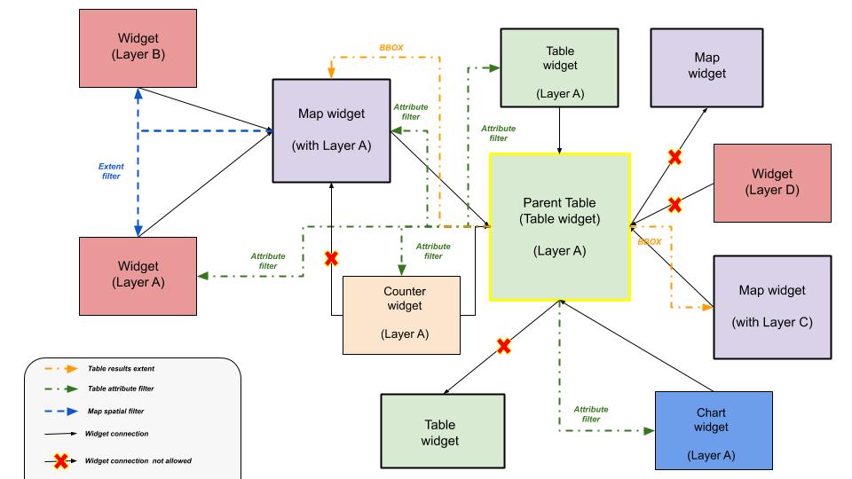 - If the widget has been created on the same dataset (layer) of the Parent Table then two filters will be applied in AND to the widget itself: the spatial filter of the Map widget and the attribute filter defined in the Parent Table