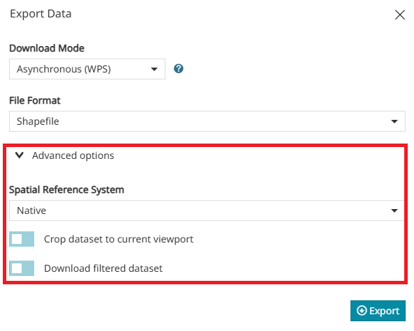 Enable the Crop dataset to current viewport for downloading only the part of the layer visible on the map at that moment (this option is present in the form only if the WPS Download process is available)