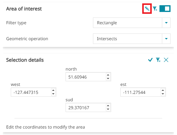 Once this filter is set, it is always possible to edit the coordinates and the dimensions of the drawn filter's geometry by clicking on the Details button