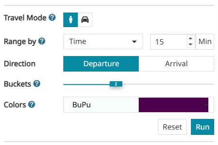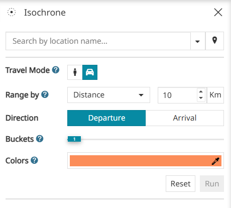 Distancein the dropdown menu for Isodistance orTimefor Isochrone as the basis for the Range - Choose the Direction between