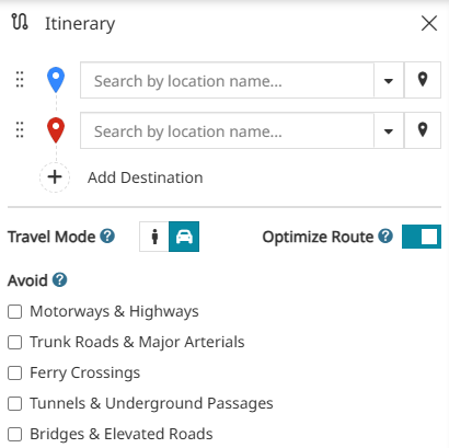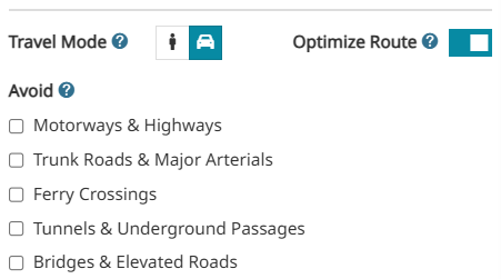 - Select one or more options to avoid: Motorways & Highways, Trunk Roads & Major Arterials, Ferry Crossings, Tunnels & Underground Passages, and/or Bridges & Elevated Roads