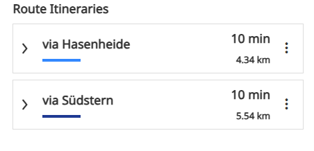 Once at least two points are defined, the available routes are listed at the bottom of the panel and displayed on the map.