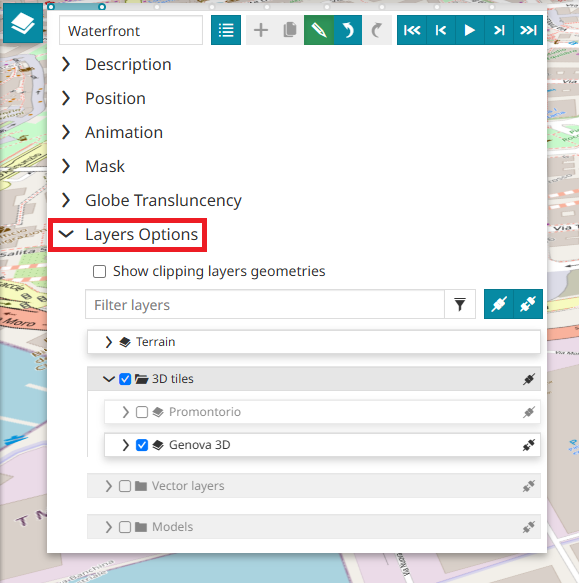In 3D mode, using the same logic described above for the Masking option, it is also possible to Clip (not Mask) each 3D Tiles or Terrain layers using a WFS or a vector layer as a clipping source. Furthermore, in this case the user can also choose which layer feature can be used as Clipping feature.