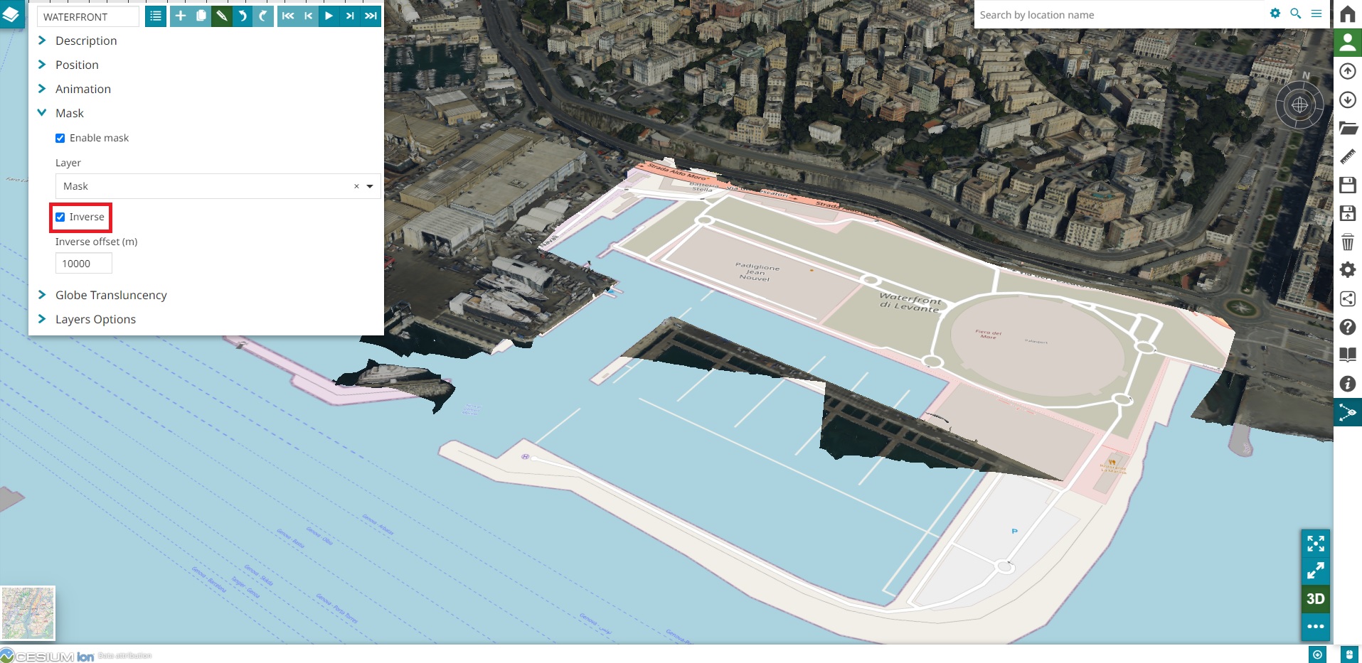 - When in 3D mode, use the Mask section to select a WFS or Vector layer available in TOC to create a mask on all the 3D tiles visible in map. The mask layer need to be added to the map before using this functionality so that it is possible to use the layer features as masking areas: if multiple WFS or Vector layers (with polygonal features) are present in the map, these are used all merged together to represent the final masking areas.