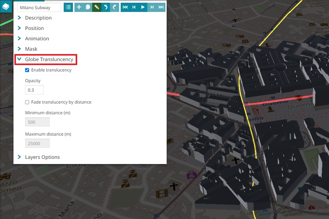 - Enable the translucency of the globe through Globe Translucency section so that it is possible to see layers under the globe's surface.