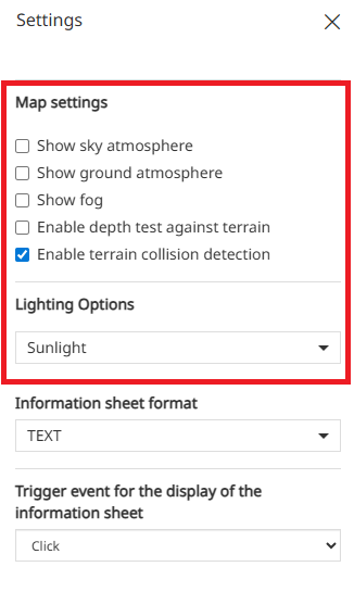 When the 3D navigation is enabled, opening the Settings panel, the editor is allowed to configure some options related to the Cesium viewer.