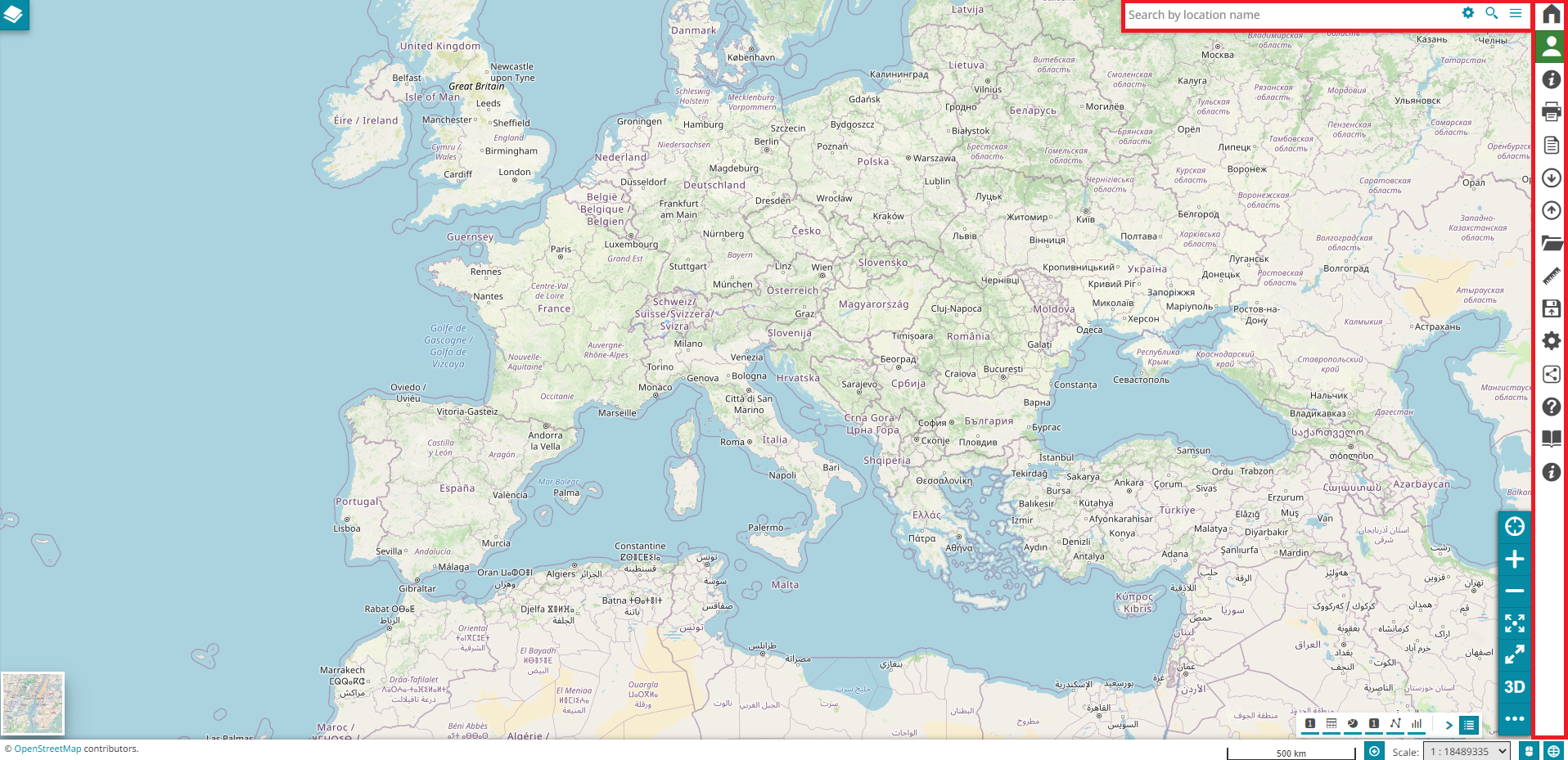 The Side Toolbar is an important component, positioned on the right side of the map viewer, that provides to the user the access to different tools of MapStore. The following tools are the ones available by default: