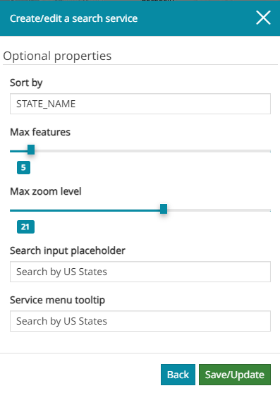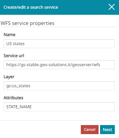 MapStore allows the user also to extend or replace the default OSM results with additional WFS Search Services. Selecting the Configure Search Services option