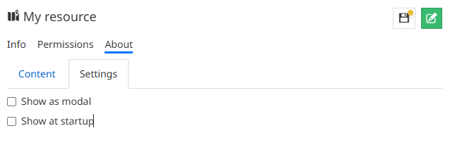 - Enable the Show at startup. If active, when the user opens a resource with defined details, these are visualized in a descriptive panel.