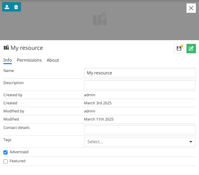 It is possible to add details as additional information in form of descriptive content for the resource itself. This is useful to associate some information to the resource and provide an overview of its content. To do that the user can write the details of the resource from the About tab.