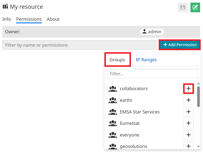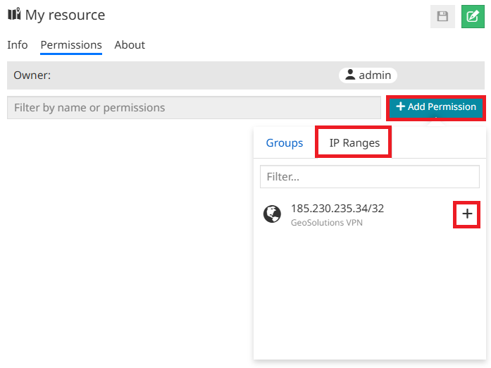 From the Permissions tab, users with the necessary permissions can define one or more rules to grant access to a resource for a specific group or IP range. In particular, it is possible to: