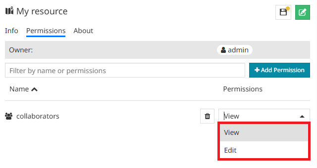 Once the rule is on the permissions list, the user can choose between View and Edit permission option.