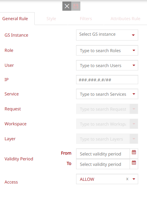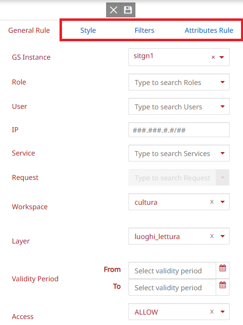 Add the Validity Period: specify the start and end dates for access to the service, workspace, and/or layer. The rule thus defined is be applied at run time only within the date period defined.