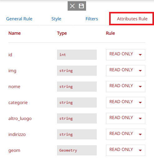 In the Attribute Table tab, the list of attributes of the layer is displayed. For each field, the user can select the access mode, choosing between: NAME, READ ONLY, and READ WRITE.