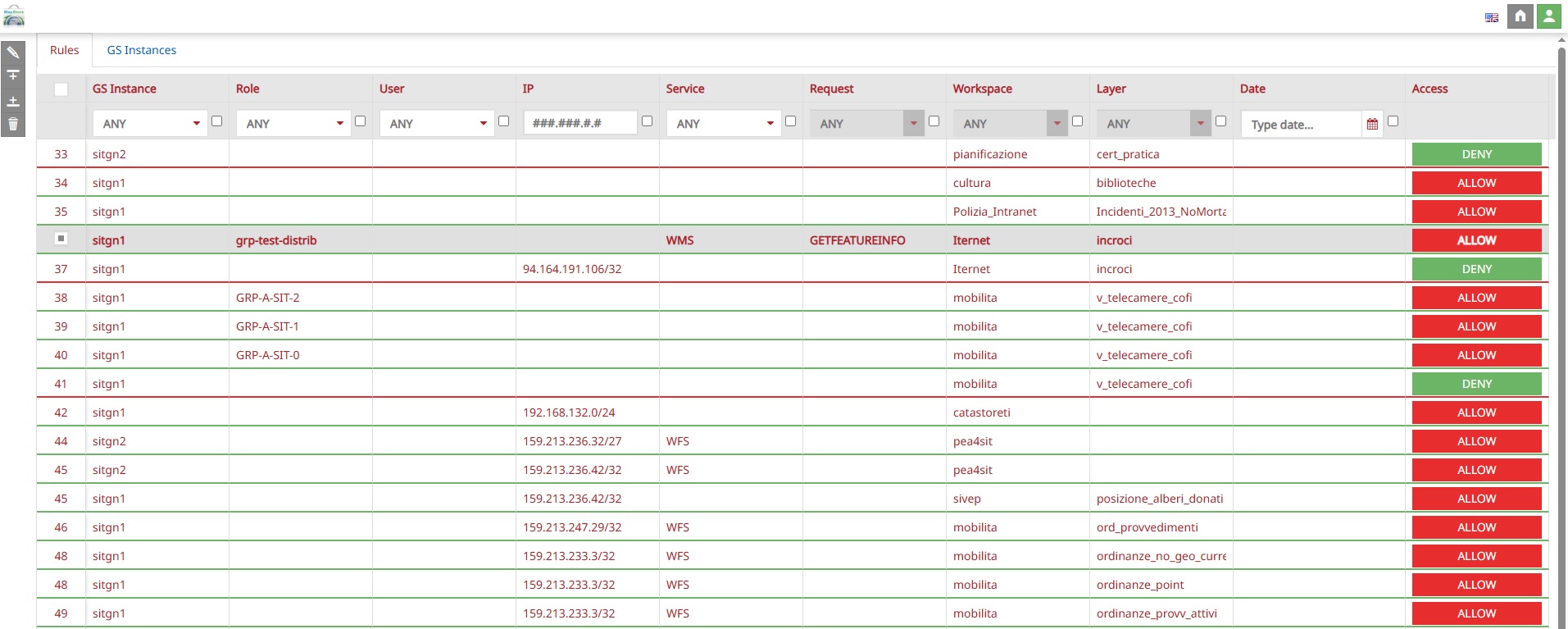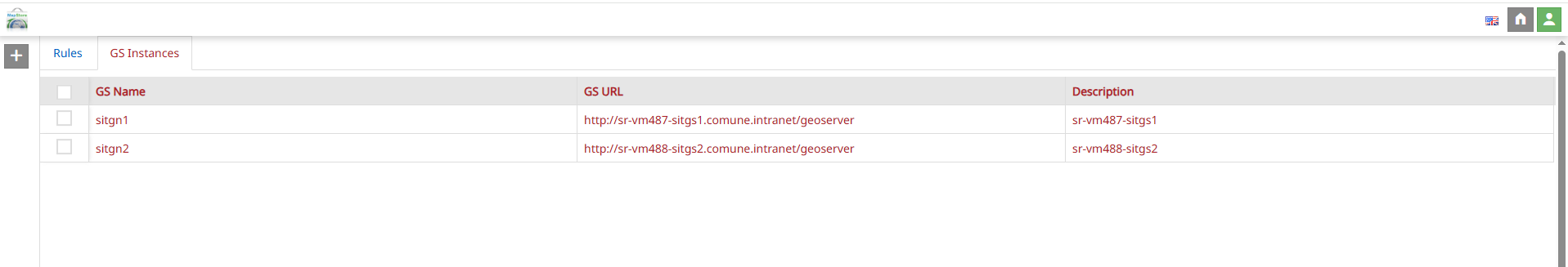 From the Rules Manager page, it is also possible to configure more than one GeoServer Instance on which to create access rules. To do this, the administrator can click on the GS Instances tab. Here, the admin user can view all the configured GeoServer instances: