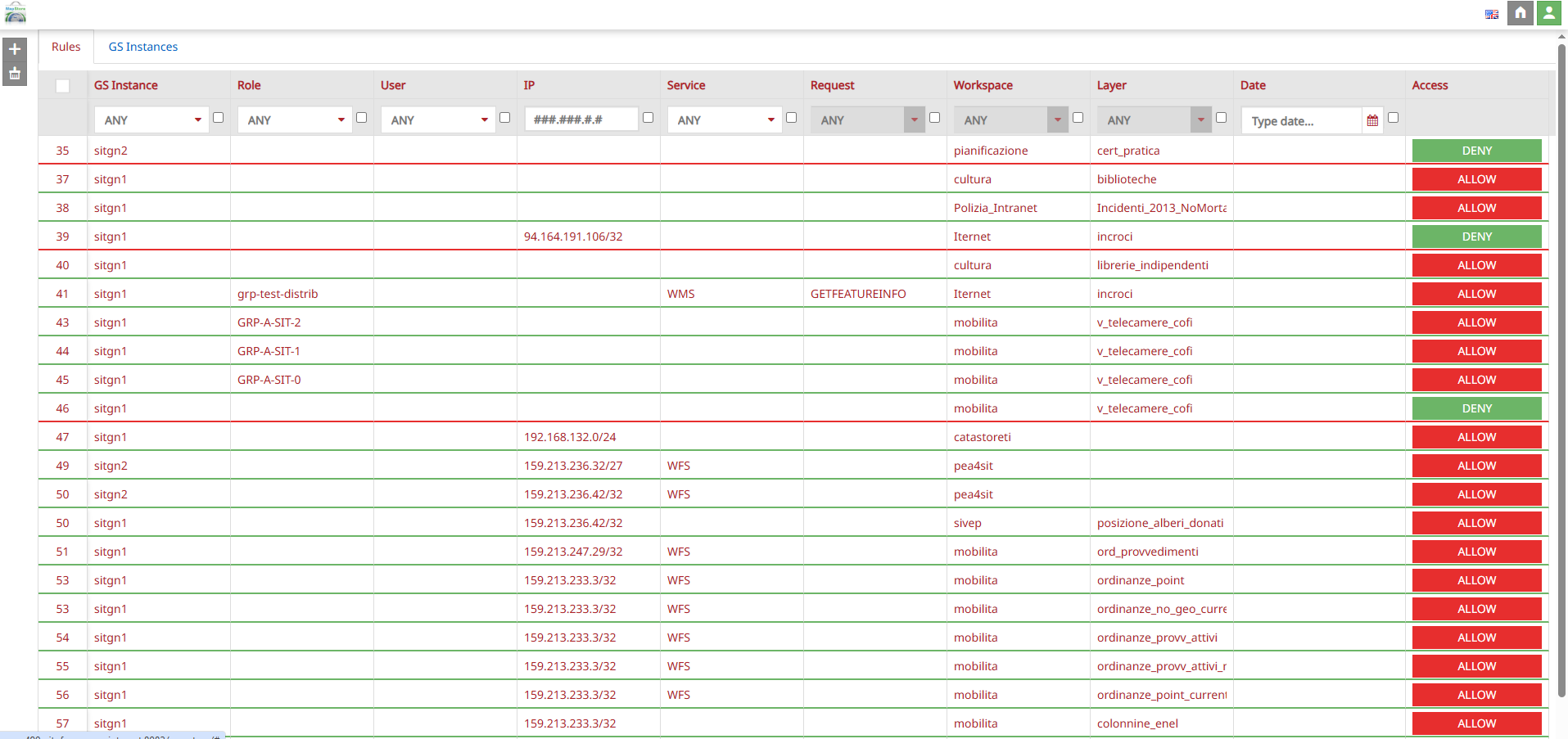 In MapStore, the Rules Manager is an administrative tool designed to manage GeoFence authorization rules on data published in GeoServer by providing a security control method for restricting access to GeoServer Workspaces, Layers and/or Services. Admin users can create and assign one or more authorization rules to allow or deny access to a specific User, Group of users, IP Range and more, with a high level of granularity.