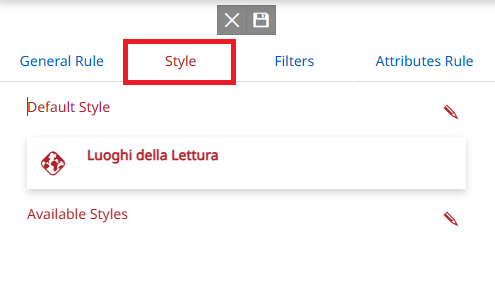By selecting the Style tab, the user can choose which styles of the layer can be displayed within the rule. The user can select between the Default Style and the Styles Available for that layer in GeoServer by using the