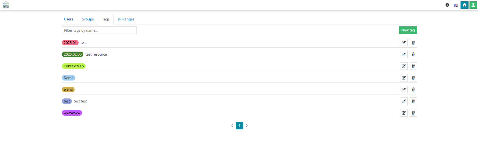 In MapStore, the Tags Manager is an administrative tool designed to manage tags to be used as a sort of keywords for resources. It is possible for authenticated users with editing rights on a certain resource (map, dashboard, etc.) to assign one or more existing tags to the resource itself within the resource properties. The Tags thus created are shown inside the resource cards and all users, including anonymous ones, can filter resources by tags by clicking directly on one of them or using the available Filter panel in the Homepage.