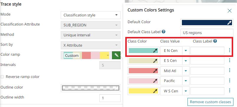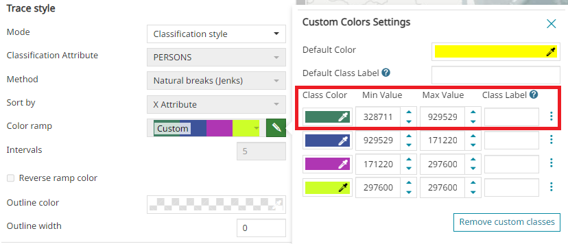 From the Color Ramp option, the user can select the Custom colors option and open the Custom Colors Settings modal through the