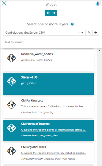 Once at least one layer is present in the map (see Catalog section for more information about adding layers), it is possible to create a widget by selecting that layer in the TOC and by clicking on the