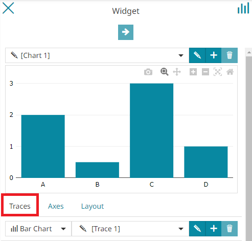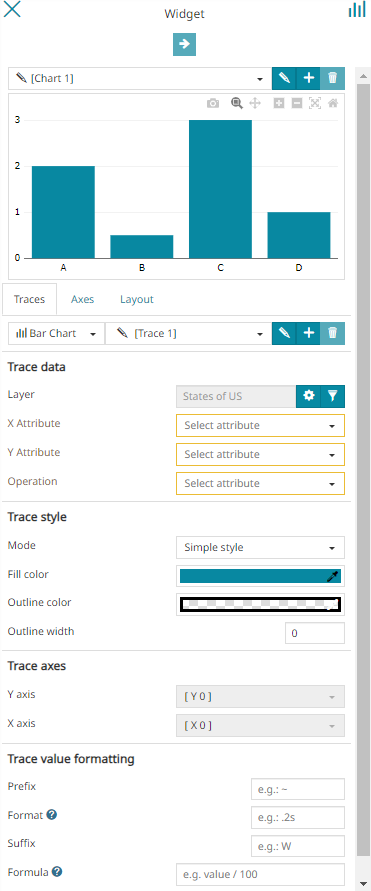 For each chart MapStore allows to define multiple Traces. With a Trace it is possible to define an additional chart representation (for the same layer by default) to be displayed in the same chart view: all traces are displayed together in the same chart. Just below the chart's preview, there is the Traces tab, where the user can: