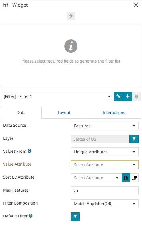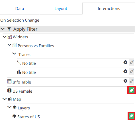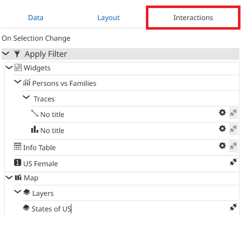 In the Interactions tab, it is possible to connect the newly created filter to the layers and widgets present on the map.