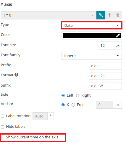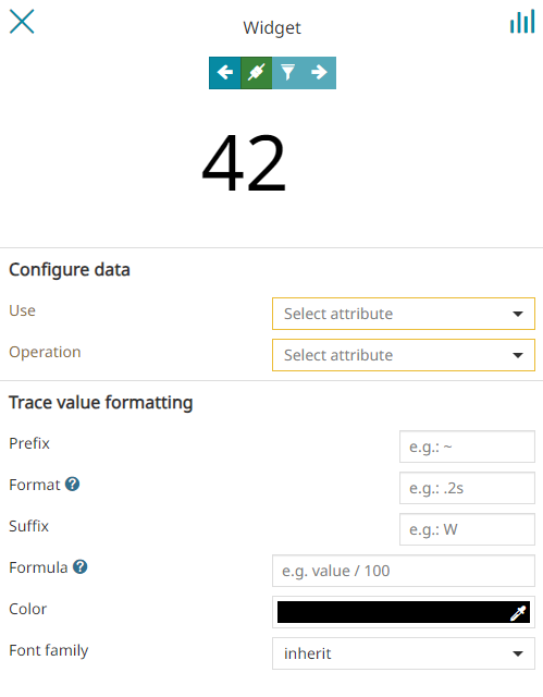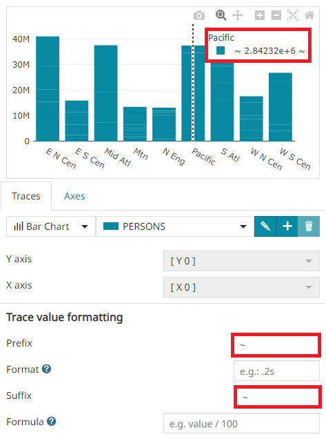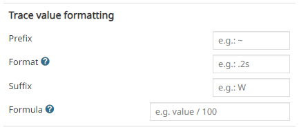 The user can customize trace value tooltips by adding a Prefix (e.g. ~), a custom Format (e.g. 0%: rounded percentage, '12%' or more) or a Suffix (e.g. Km). It is also possible to configure a Formula to transform tick values as needed (e.g. value + 2 or value / 100 or more)