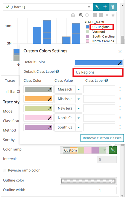 - Change the default Color of bars or slices (depending on the chart type) through the Color Picker. This color will be applied for all values for which a Class Color has not been configured.