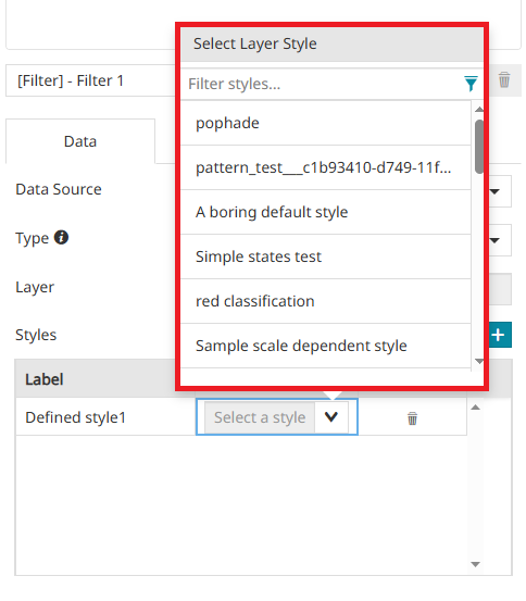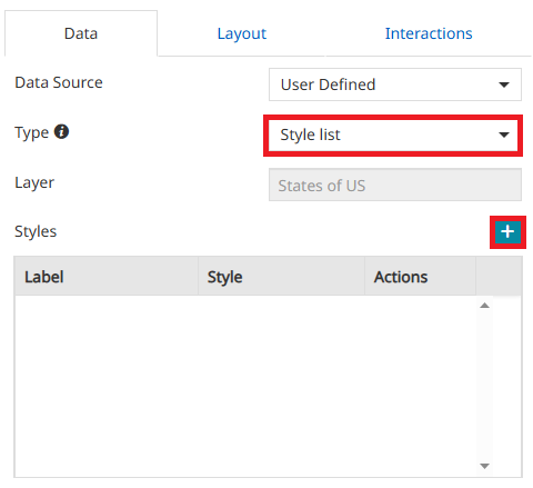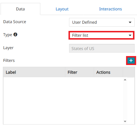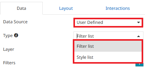 By selecting User Defined as the Data Source, the user can create a List of Filters or a List of Styles to use as items in the dynamic filter widget.