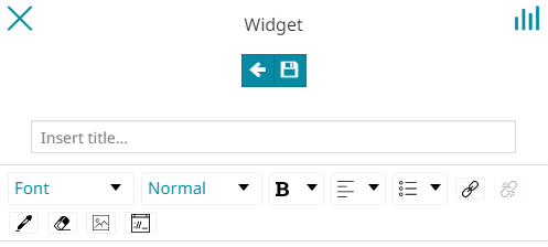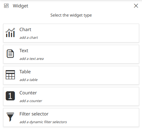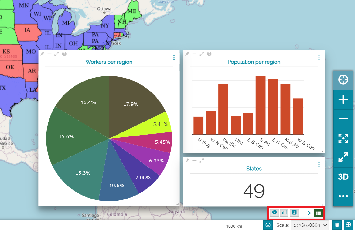In MapStore it is possible to create widgets from the layers added to the map. Widgets are components such as charts, texts, tables and counters, useful to describe and visualize qualitatively and quantitatively layers data and provide the user the opportunity to analyze information more effectively.