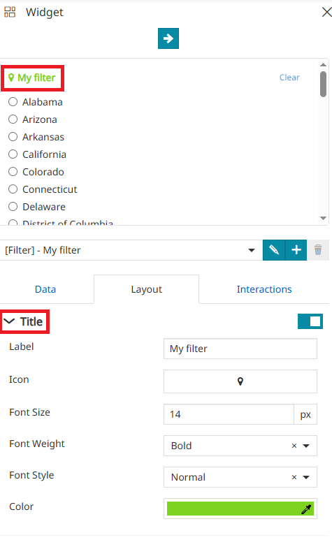In this tab, the user can customize the filter layout and preview it in real time. In particular, the user can modify the Title and the Items.